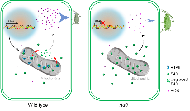 研究表明,RTA9蛋白与逆境响应蛋白S41发生物理互作,并负调控S40蛋白的稳定性。遗传实验证实,敲除S40可增强抗蚜性,而过表达S40则导致感蚜表型,表明S40是抗蚜途径中的负调控因子。在rta9突变体中,蚜虫取食诱导的活性氧积累显著降低,抗氧化相关基因表达受阻,削弱了植物防御反应;相反,s40突变可激活ROS相关基因表达,促进蚜虫侵染部位的ROS爆发,从而增强抗性。该研究首次揭示了一条基于线粒体蛋白—ROS稳态的玉米抗蚜信号通路(图2),拓展了植物—害虫互作的理论框架,也为玉米抗虫育种提供了新策略。