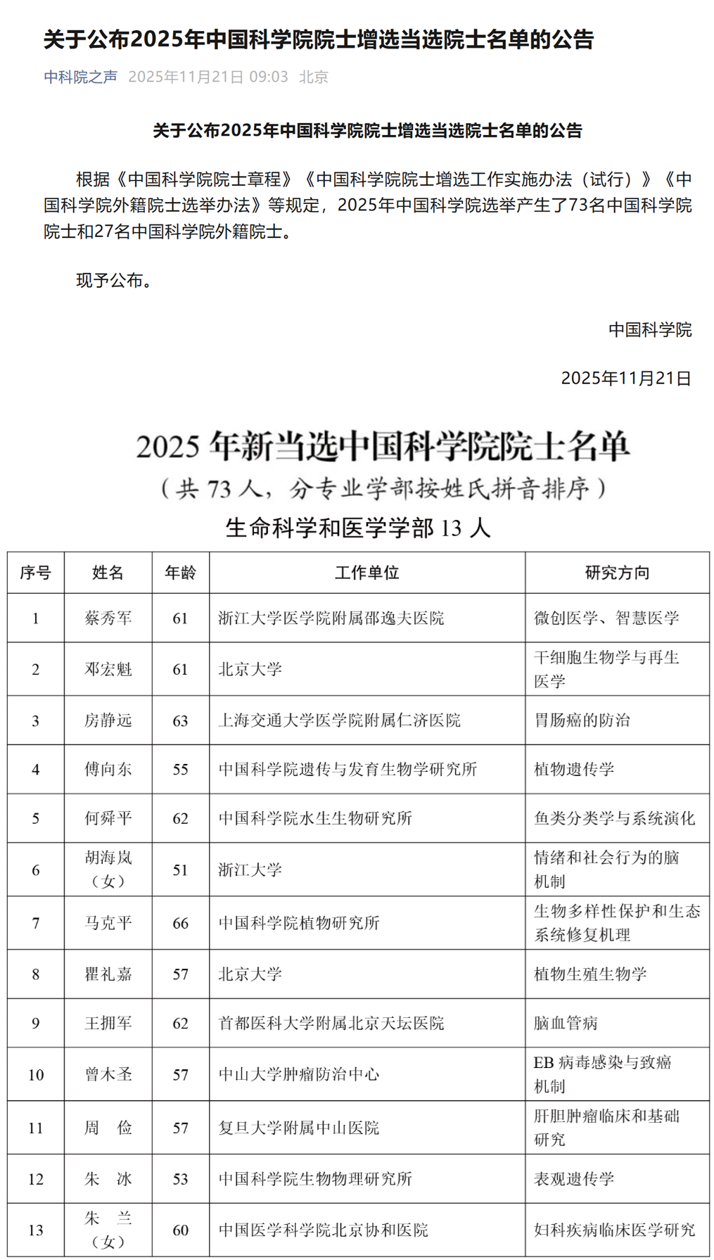 11月21日,中国科学院公布2025年院士增选情况,选举产生了73名中国科学院院士和27名中国科学院外籍院士。中国遗传学会常务理事傅向东、高级会员邓宏魁、王拥军和朱冰当选2025年中国科学院院士。