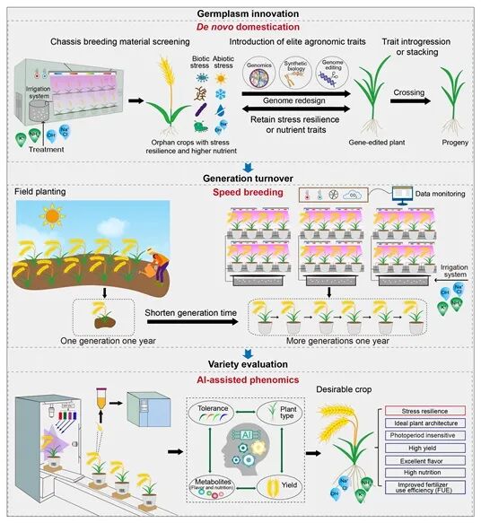 研究团队提出了AI赋能的DSAP (De novo domestication + Speed breeding + AI-empowered phenomics)整合生物育种策略,通过从头驯化技术(De novo domestication)、育种加速器快速育种技术(Speed breeding)和AI赋能的表型组学技术(AI-empowered phenomics)的深度融合,全面加速种质创新、种质迭代、品种评价三个育种关键环节,为孤儿作物的高效改良提供系统性解决方案。使用从头驯化技术快速提高孤儿作物的产量和品质性状,保持其耐逆和风味等特色性状,使“野生作物”快速跃迁为“可规模化栽培的新作物”,加速种质创新。育种加速器快速育种技术则通过人工光源延长光周期,实现孤儿作物周年多代繁育,加速遗传重组与世代更替进程,大幅提高育种迭代速度,高效固定优良性状,缩短新品种选育周期。AI赋能的表型组学通过融合智能成像、传感监测和人工智能算法,实现对孤儿作物表型与环境参数的高通量、智能化采集与分析,提升种质筛选与品种评价的准确性和效率。将三项技术整合可形成贯穿育种全流程的“孤儿作物快速育种技术体系”,为孤儿作物从资源改良到新品种培育提供了高效育种路径。