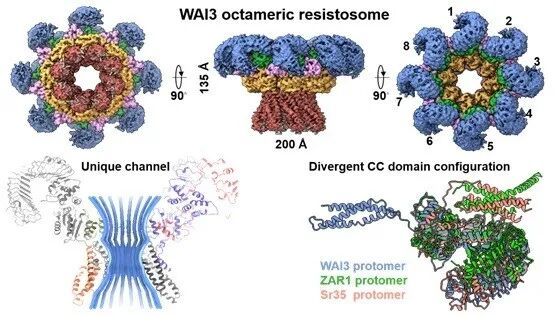 2026年3月20日,中国科学院遗传与发育生物学研究所刘志勇研究员带领的植物免疫团队联合英国塞恩斯伯里实验室、中国科学院分子植物科学卓越创新中心、湘湖实验室(农业浙江省实验室)及郑州大学等多家单位在Cell杂志在线发表了题为An activated wheat CCG10-NLR immune receptor forms an octameric resistosome的研究论文。该研究从小麦中克隆了编码CCG10-NLR蛋白的自发免疫基因WAI3 (Wheat Autoimmunity 3),在本生烟中大量纯化蛋白并结合冷冻电镜技术解析了激活后WAI3的蛋白结构,揭示其激活后形成八聚体抗病小体,且在植物中特异地引发钙离子内流,进而引发免疫反应。进一步还明确了拟南芥中的同源蛋白RPS2激活后同样形成八聚体抗病小体,在植物中引发钙离子内流,表明CCG10-NLR抗病蛋白的功能机制在单子叶和双子叶植物中高度保守。此外,该研究证明了WAI3抗病小体在单体数目及构象上均不同于现有已知的抗病小体,阐明了一种新的NLR抗病小体组装机制,拓宽和加深了对NLR介导的植物免疫机制的认识。