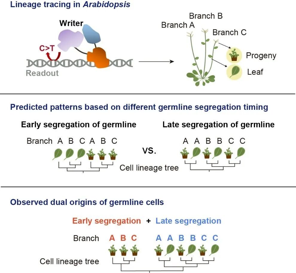 基于该细胞谱系树,研究团队发现拟南芥生殖系细胞存在两种分离模式:部分生殖细胞在花序分生组织形成过程中分离(late segregation),另一些则在更早阶段,在分枝形成之前即已分离(early segregation)。后者类似于动物中的“魏斯曼屏障”,揭示了拟南芥中存在比现有认知更早期的生殖系分离过程。该发现为理解植物如何限制突变向后代传递、维持基因组稳定性提供了新证据。